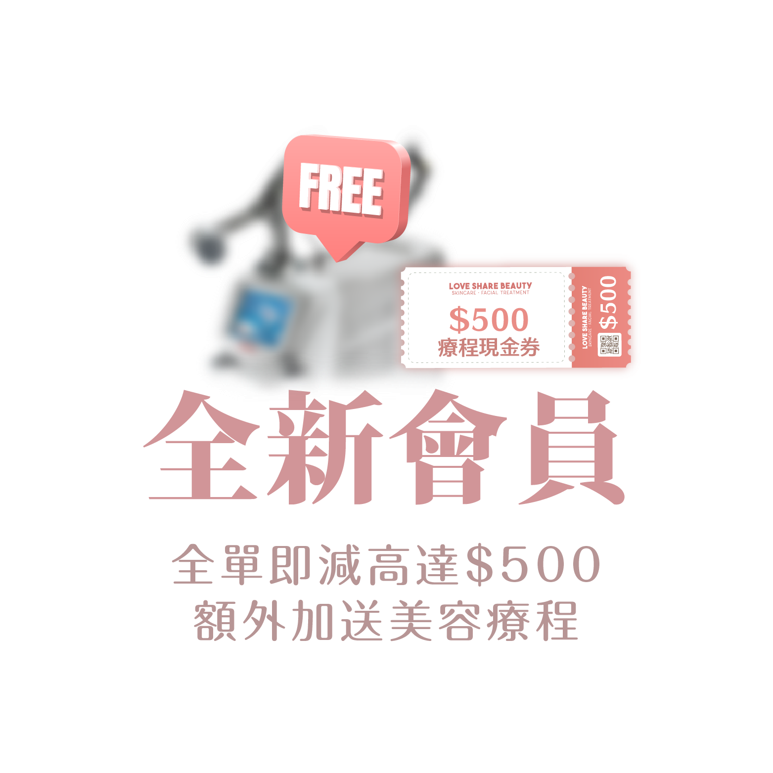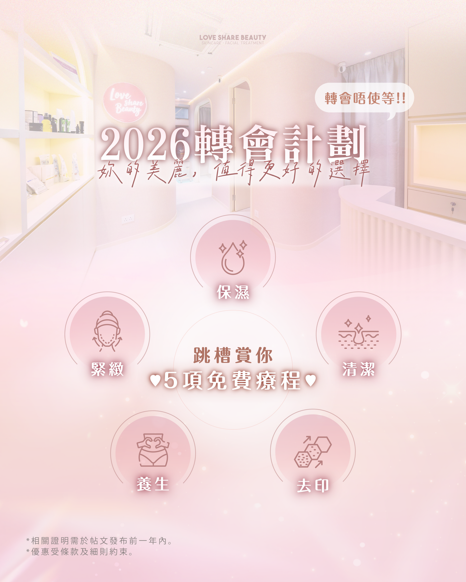 即日起全新客戶只需出示任何香港美容院一年內的療程購買記錄,並於Love Share Beauty首次消費滿$5,000(折扣後計算),即可免費獲贈指定美容療程5次,內容涵蓋清潔、保濕、緊緻、煥膚、養生,賞您由內靚到外!