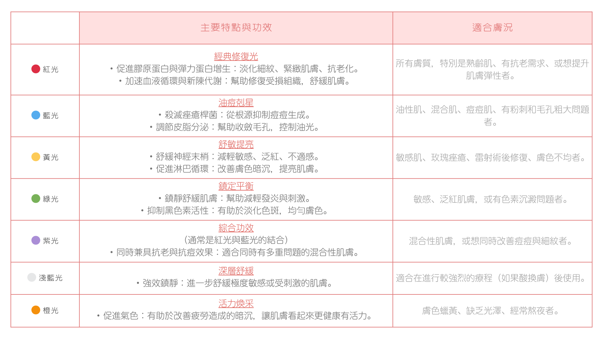 - 藍光: 抑制痤瘡粉刺及抵禦日曬傷害